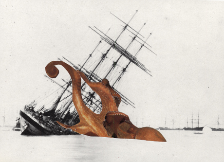 Architeuthis monachus, 2013. Collage: Buchausschnitte auf Buchseite, gerahmt