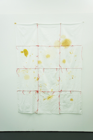 Last Dinner 1, 2011. 12 Baumwollservietten zusammengenäht, Spuren eines Abendessens vom 24.05.2011, 150 x 200 cm