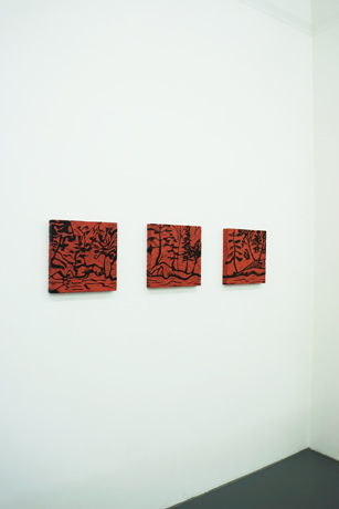 Scenery, 2012 Holzschnitt und Öl auf eingefärbtem MDF, 3-teilig, 35 x 35 x 4 cm