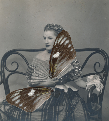 Ohne Titel, (Schmetterlingsflügel) 2011 Collage, Foto (Fundfoto), Schmetterlingsflügel, alter Rahmen Werkmass: 10 x 9,1 cm