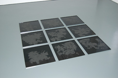 Laguna morte, 2005/08. 9-teilige Bodenarbeit, verzinkte Blechbecken mit Gewässer und Kohle-/Russstaub, 150 x 150 cm.