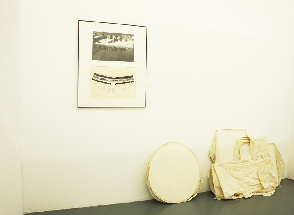 Cinque piedistalli (Alberto Giacometti gewidmet), 1993. 1. August 1993, Vadret dal Forno, Bregaglia, 46°18’17’’N / 9°41’56’’E, 2600 m ü. M.. Tracce di luce solare, 27. Juli 1993 Auflage der Tücher / 1. August 1993 Abdeckung der Tücher Installation mit Abdecktüchern: Speerholz, Baumwolle
