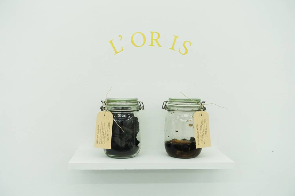 Goldschrift „L’OR IS“. Glas mit modrigen Pilzen; Glas mit Asche des Buches „Der Schwierige/Der Unbestechliche“ Etiketten mit hermetischen Fragmenten von Hugo v. Hofmannsthal, ca. 50 x 50 cm.