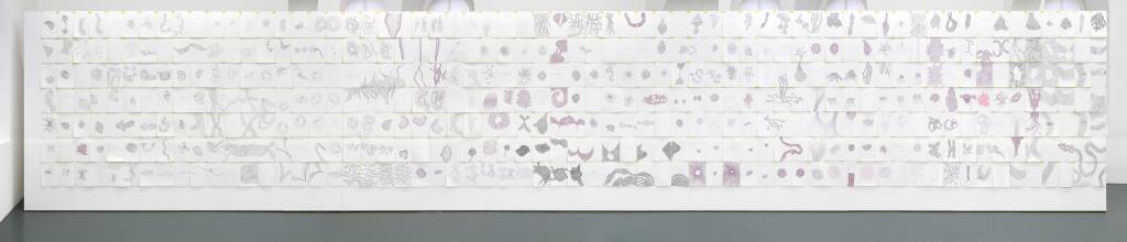 Zeichnungsinstallation 448-teilig; Farbstift, Bleistift, Tusche auf Papier, je 21 x 29,7 cm.