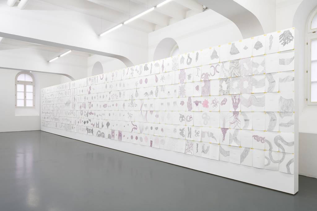Zeichnungsinstallation 448-teilig; Farbstift, Bleistift, Tusche auf Papier, je 21 x 29,7 cm.