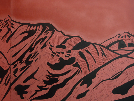 Val Ferrera, 2011. Holzschnitt und Öl auf eingefärbtem MDF,Ausschnitt, zweiteilig.