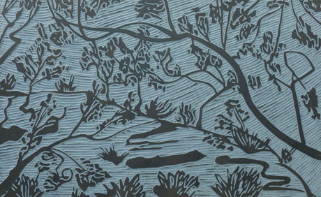 Ohne Titel, 2012. Holzschnitt und Öl auf eingefärbtem MDF, 63 x 103,5 x 5 cm.