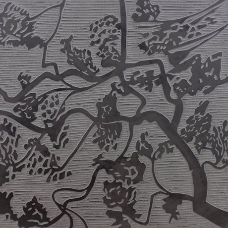 Pflaumenbaum, 1/3, 2012. Holzschnitt und Öl auf eingefärbtem MDF, 74,5 x 75 x 6 cm.