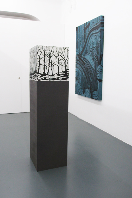 White Cube, 1/2, 2012. Holzschnitt und Öl auf eingefärbtem MDF, 40 x 40 x 40 cm. Ohne Titel, 2012 Holzschnitt und Öl auf eingefärbtem MDF, 168 x 110 x 7.5 cm.