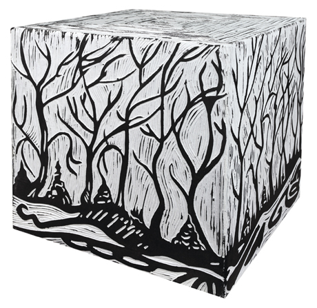 White Cube, 1/2, 2012. Holzschnitt und Öl auf eingefärbtem MDF, 40 x 40 x 40 cm.