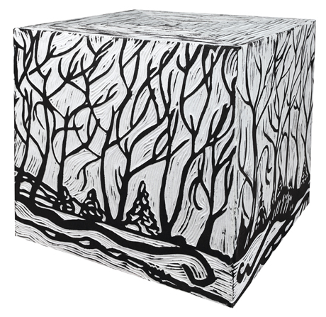White Cube, 1/2, 2012. Holzschnitt und Öl auf eingefärbtem MDF, 40 x 40 x 40 cm.