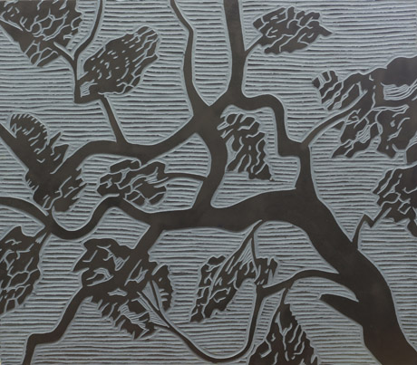 Ohne Titel, 2012. Holzschnitt und Öl auf eingefärbtem MDF, 70 x 80 x 8 cm