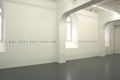 1 Schriftbild, 11.4 x 2420 cm. Farbauftrag mittels Schablone und Farbroller, Mineralfarbe, 1-farbig in Form eines Schriftband/Fries. Schrifttyp Gotic13, Höhe eines Buchstabens 11.4 cm.