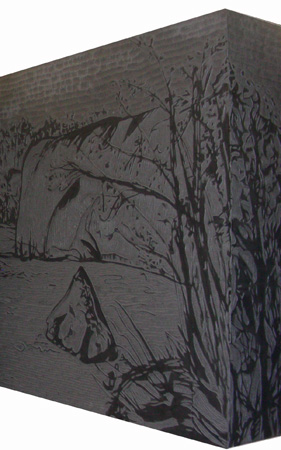 Holzschnitt und Öl auf eingefärbtem MDF, 110 x 100 x 24 cm.