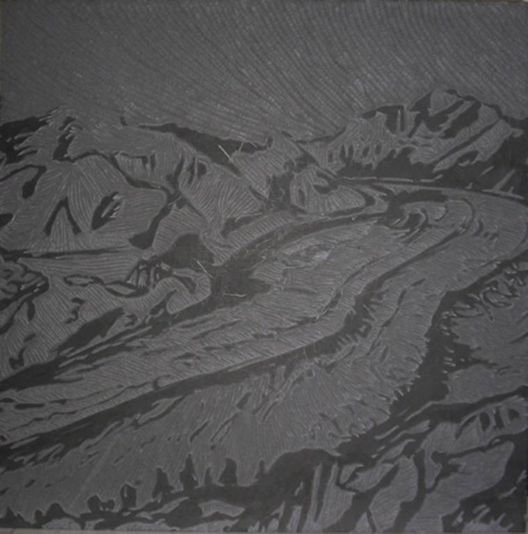 Holzschnitt und Öl auf eingefärbtem MDF, 70 x 70 x 19 cm.