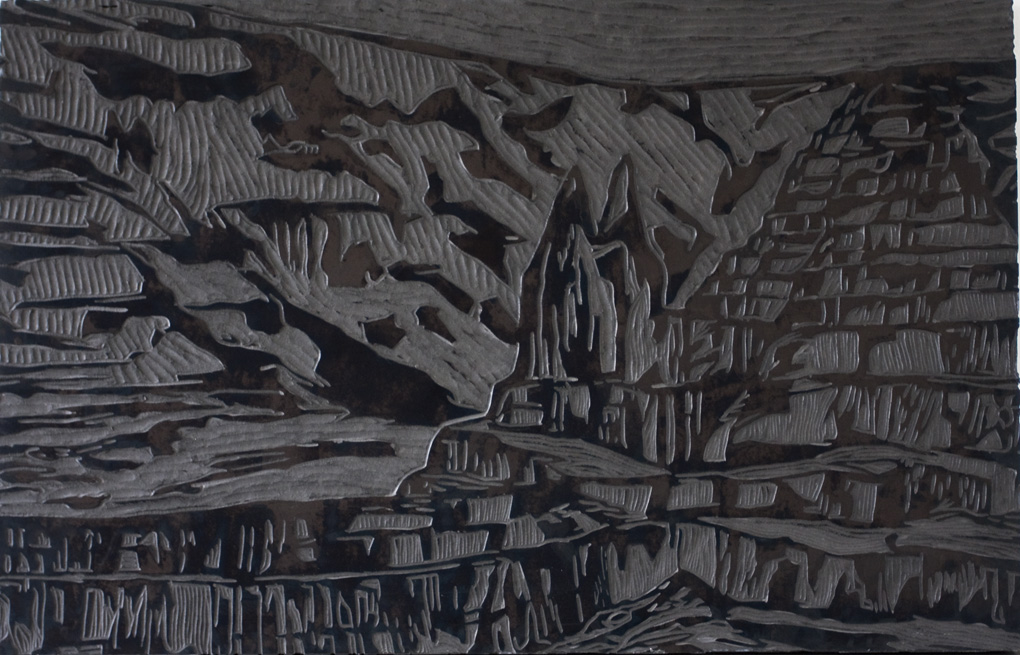 Holzschnitt und Öl auf eingefärbtem MDF, 110 x168 x 7,5 cm.