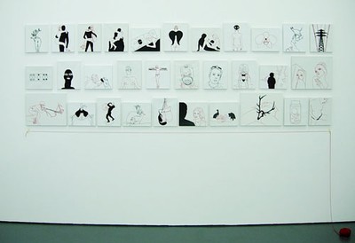 Garn gestickt und Acryl auf Leinwand, 31-teilig 25 x 30/30 x 25/35 x 45 cm.