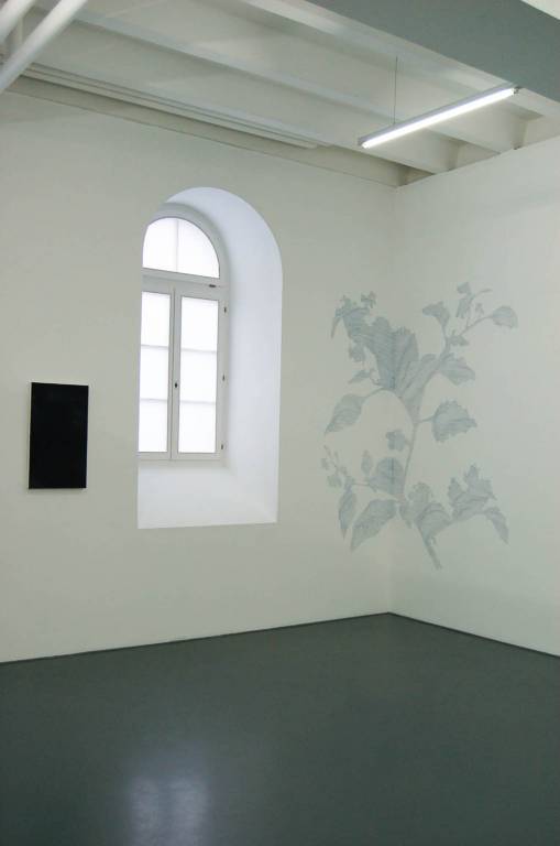 Conrad J. Godly MEZZA LUNA, 2009. Öl auf Leinen, 70 x 40 cm. Evelina Cajacob Nachtschattengewächs, 2009. Wandzeichnung, Farbstift auf Wand, Masse variabel.