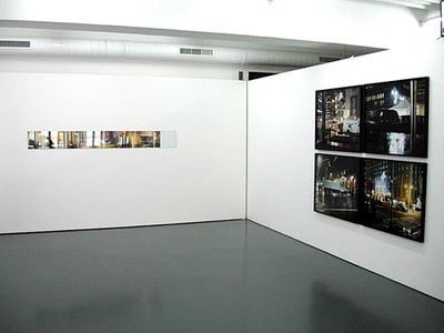 Ausstellungsansicht. CORPORATE GUARDS, 2002 / 2007. New York, World Economic Forum WEF, Februar 2002. 6-teiliges Serigraphie-Leporello in bedrucktem Schuber. Temporary Discomfort; Chapter III, 2002. WEF, New York City, Januar 2002. Zone B, Outside Hotel Astoria, Sector 16/21. C-Print auf Aluminium 80 x 100 cm. WEF, New York City, Januar 2002. Zone B, Outside Hotel Astoria, Sector 15/1. C-Print auf Aluminium 80 x 100 cm. WEF, New York City, Januar 2002. Zone B, Near Hotel Astoria, Sector 21/6. C-Print auf Aluminium 80 x 100 cm. WEF, New York City, Januar 2002. Zone B, Hotel Astoria, Sector 10/12. C-Print auf Aluminium 80 x 100 cm.