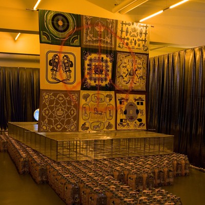 Hermès-Foulards. Wasserflaschen, Klarsichtfolie, Möbelsystem, Glittervorhang, 5.00 x 2.45 x 3.20 m.