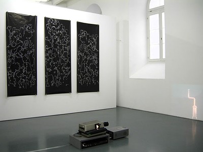 MONIKA VON AARBURG Distraction 2006. Tipp-Ex auf Glanzpapier, 3-telig, je 180 x 70 cm. GABRIELA GERBER & LUKAS BARDILL Eskimo, 2006. Video- und Lichtbildprojektion, Loop 3 Min. 20 Sek. Masse variabel. Auflage: 3 Exemplare, Preis ohne Geräte.