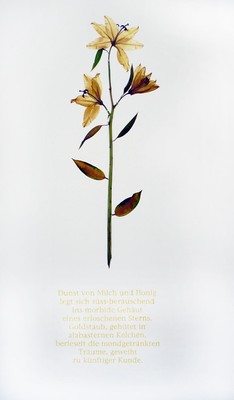 Wandarbeit: gepresste, getrocknete weisse Lilien, lyrisches Epigramm aus Lilienblütenstaub, 130 x 40 cm.