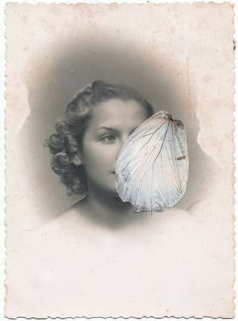 Ohne Titel, (Schmetterlingsflügel) 2011 Collage, Foto (Fundfoto), Schmetterlingsflügel, alter Rahmen, 7,2 x 10 cm