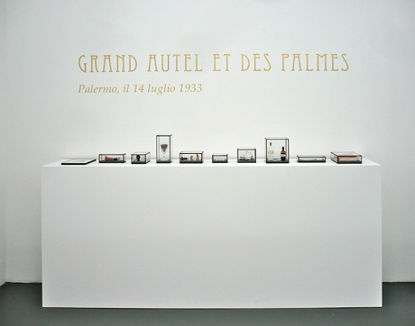 10 Glasvitrinen (Inhalt: div. Objekte/Materialien, 1 Cyanotypie, Roman „Locus Solus“), Goldschrift auf Wand