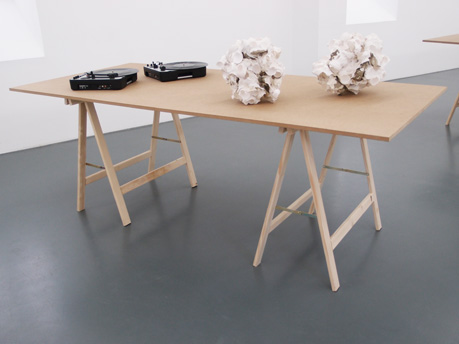 Plattenspieler, Vinylplatte, Masse variabel Eierschale, Gips, Lehm, je 30 x 35 x 40 cm