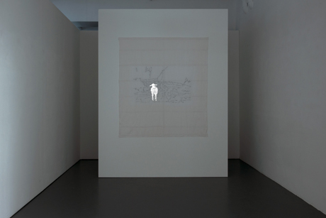 Tschut, 2011. Videoinstallation, Stickgarn auf Leinen, Loop à 1min40s.