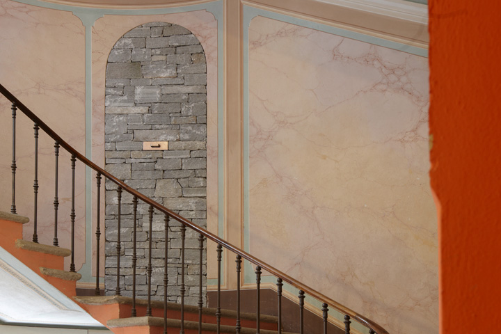 • Conrad J. Godly: ‹The Message›, 2011 Installation, Trockenmauer aus Soglioquarzit, Schublade aus Stahlblech mit geheimem Inhalt, 290 × 99 × 55 cm, Treppenhaus vom 1. zum 2. Obergeschoss, Bild: © Ralph Feiner  » Klicken zum Vergrössern ->