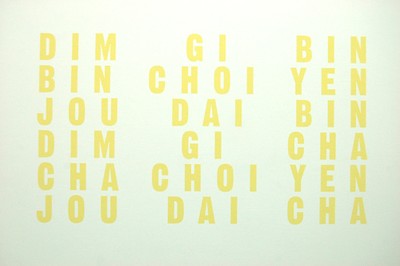 3 Schriftbilder, Schriftbild 3, 79,5 x 139 cm. Farbauftrag mittels Schablone und Farbroller, Mineralfarbe, 1-farbig über die ganze Fläche. Schrifttyp Gotic13, Höhe eines Buchstabens 11.4 cm