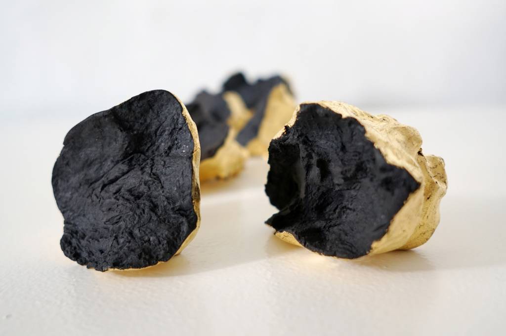 Keramik Schwarzbrand, Blattgold; Multiple 1/7-7/7 (jedes ein Unikat), je ca. 8 x 8 x 5 cm.