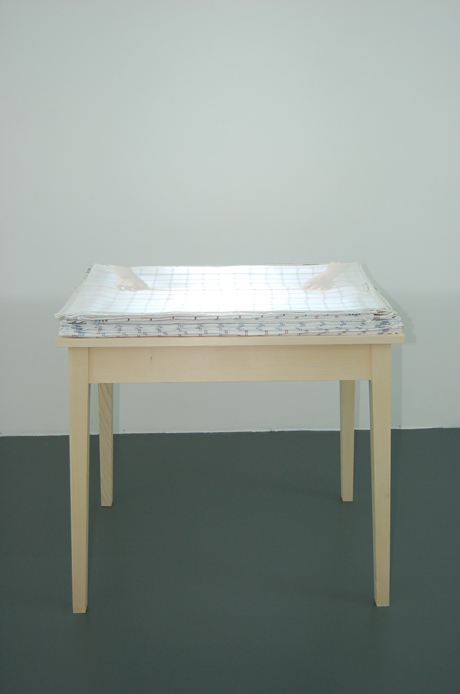 HandArbeit, 2010. Videoinstallation, 5 Min 3 Sek Loop mit Ton. Tisch, Handtücher, 49.5 x 79 x 80 cm