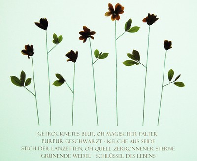 Wandarbeit, Variante 1. Magnolienblüten / -blätter, gepresst, getrocknet, Kupferstäbe, patiniert mit Vitriol und Maitau lyrisch-hermetisches Destillat (Alig’08) aus Weinkonzentrat, 110x125 cm.