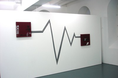 Acryl und Stift auf Leinwand, 55 x 55 x 6 cm. Acryl auf Wand, Masse variabel. Acryl und Stift auf Leinwand, 55 x 55 x 6cm.