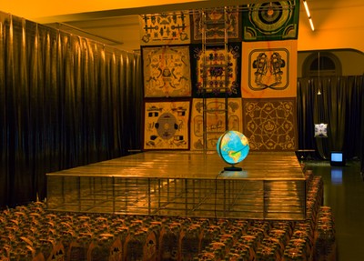 Hermès-Foulards. Wasserflaschen, Klarsichtfolie, Möbelsystem, Glittervorhang, 5.00 x 2.45 x 3.20 m.