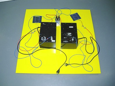 Plexiglasplatte 100 x 100 cm; 2 Solarzellen, 4 Cip, DI-Box, 2 Aktivboxen, Stablampe, Kabel; Unikat.