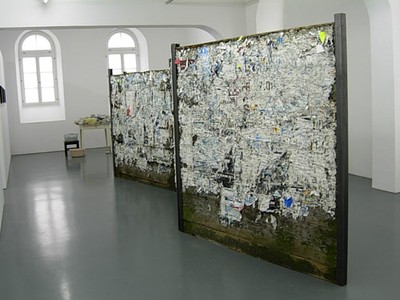 Mehrteilige Bretterwand, Plakatreste. Masse variabel.