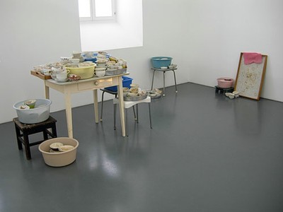 Milchkaffee und Kakao getrocknet auf Porzellan. Kaffeegeschirr, Plastikbecken auf Küchenmöbeln; Masse variabel.
